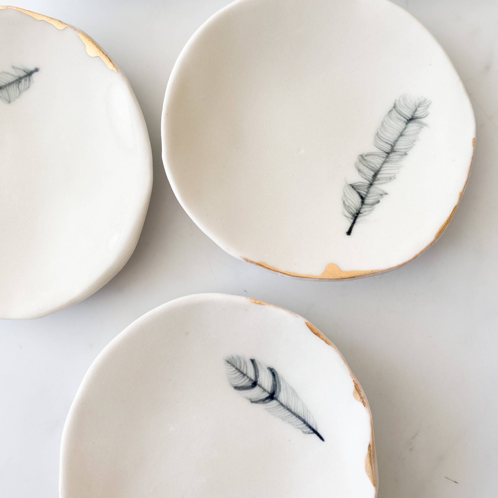 These trinket dishes are formed individually by hand, painted with a free-form feather, and covered in a glossy food-safe glaze. Finished with a flourish of precious 22k gold.