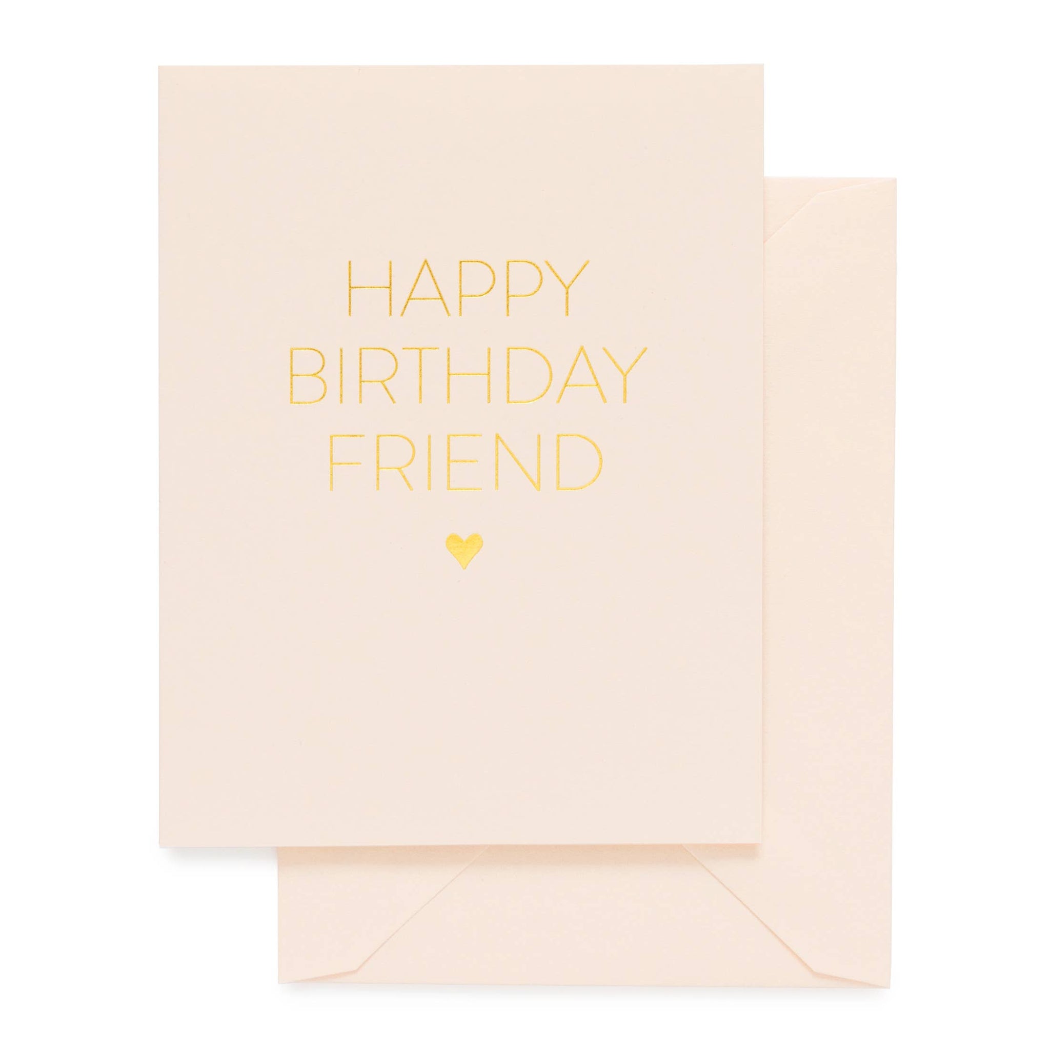 Our Friend Birthday card is letterpress printed by hand on antique machinery. Gold foil on pale pink paper, paired with a pale pink envelope. Folded card, blank inside.