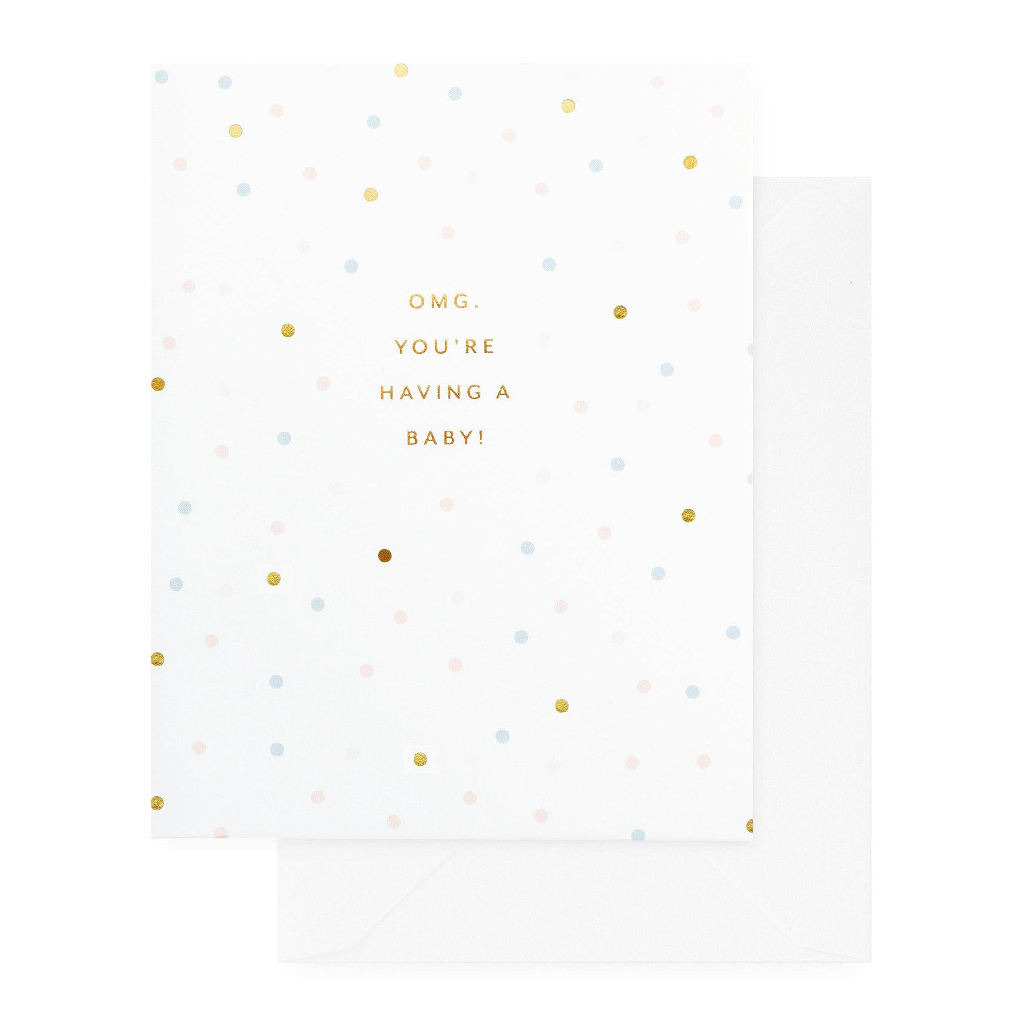 Hand printed in Los Angeles. * 4.25 x 5.5 inches * Folded Card * Foil Printed * Crisp White Paper * Gold Foil * Pink, Blue, + Gold Dot Pattern * Crisp White Envelope *