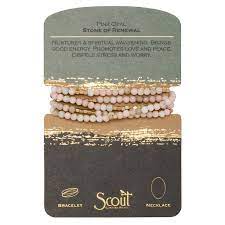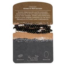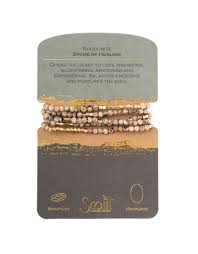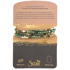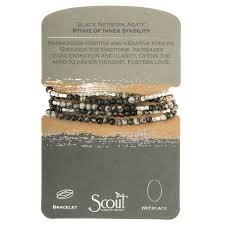 Semi precious gemstones adorn wrist & neckline. Effortlessly converts from bracelet to necklace. Can be wrapped 4-5 times as a bracelet and 1-2 times as a necklace.